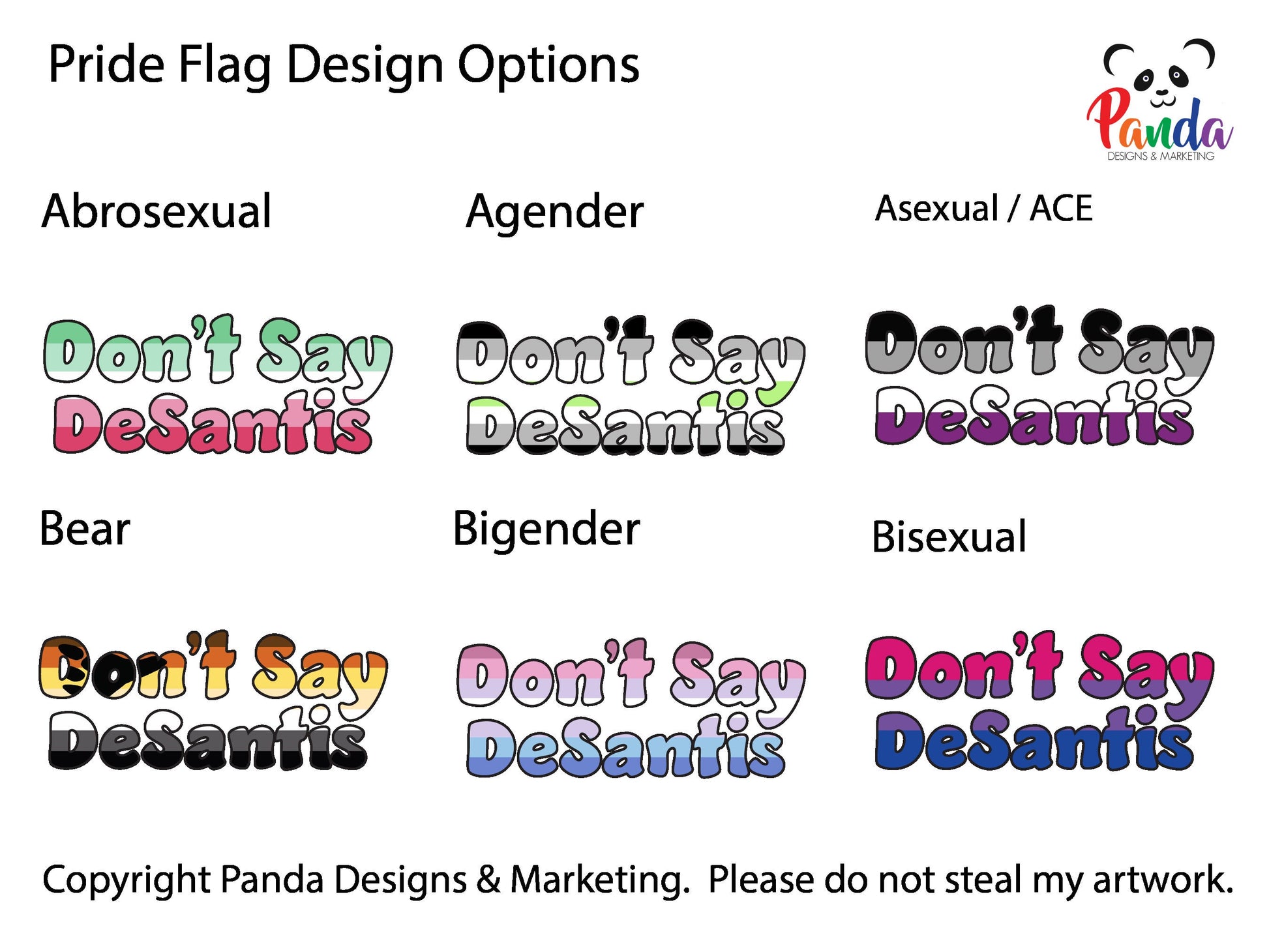 Make a bold statement of disdain and express your pride with our vibrant "Don't Say DeSantis" Pride Flag Shirt. This shirt features the powerful message "Don't Say DeSantis" in your choice of 24 different pride flags and colors.