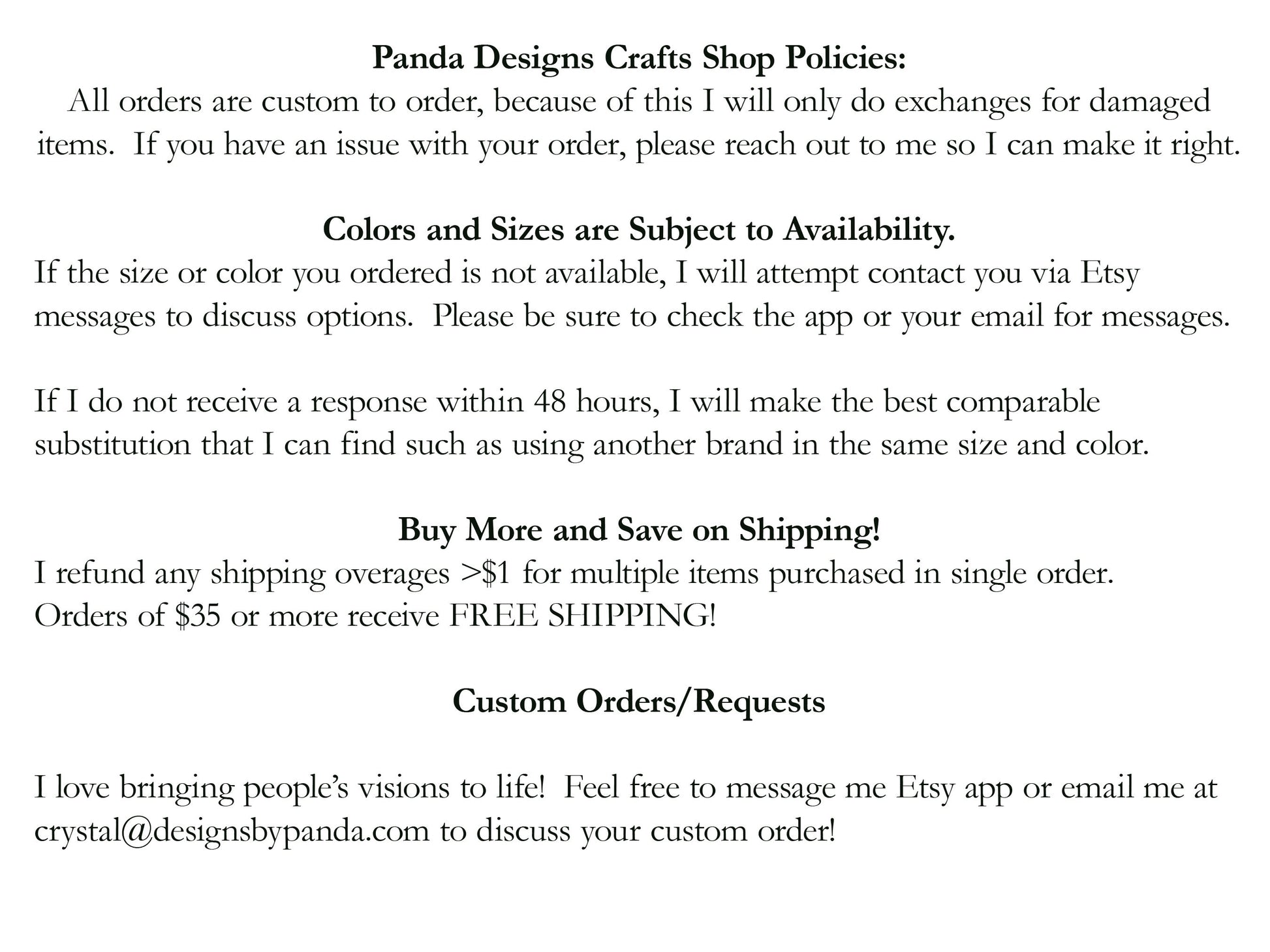 While I make every effort to have colors in stock, with supply chains the way they have been, I may need to substitute the brand in order to get the color and size that you request. If I need to make a substitution I will contact you. I kindly ask that you respond within 24 hours so that your shipment is not delayed.