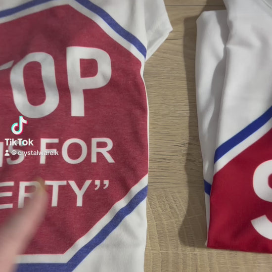 The front design features official STOP Moms for "Liberty" logo on the front center chest.